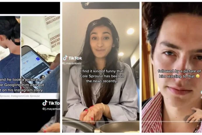 Musician J.Maya shared on TikTok her cringeworthy encounter with Cole Sprouse at an ice cream shop in 2018. After Googling him, Sprouse took a picture of her and posted it on his Instagram Story, which went viral. J.Maya asked for a photo and Sprouse deadpanned, "Yeah, I saw you Google me." Despite trying to keep her identity private, media outlets contacted her and her name was included in articles about the encounter. J.Maya's video has 1.8 million views and others shared their own awkward encounters with Sprouse.