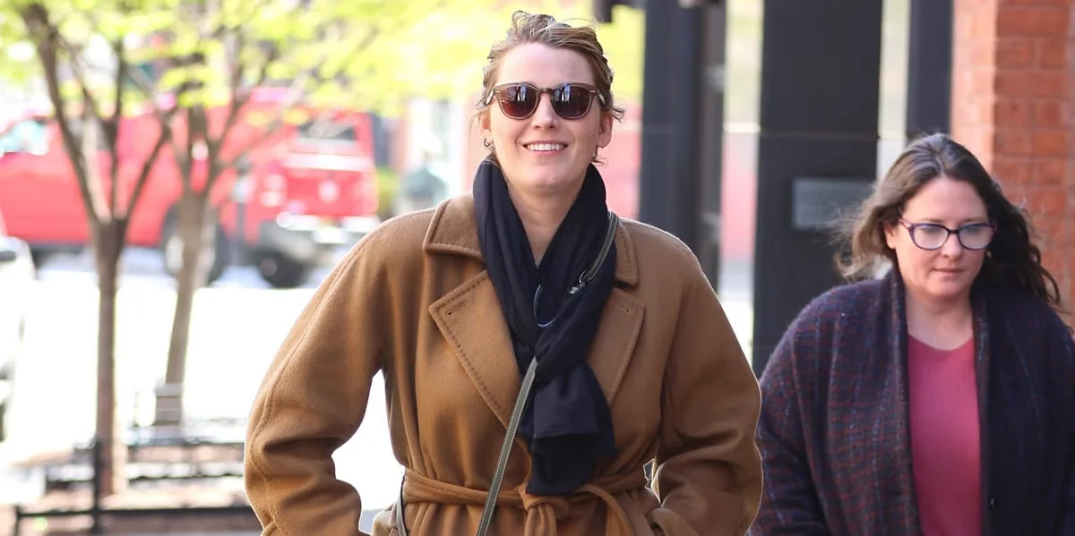Blake Lively was spotted in New York City wearing a casual outfit consisting of black jogger sweatpants, a caramel wrap coat, chunky sneakers, and a military green crossbody phone pouch. The actress recently gave birth to her fourth child with husband Ryan Reynolds, whose name and gender have yet to be publicly disclosed.