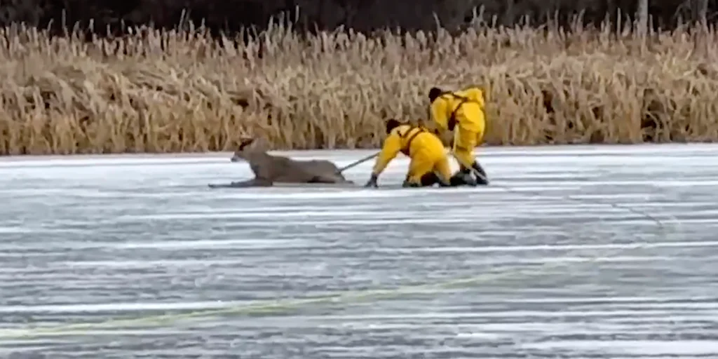Two firefighters in Prior Lake, Minnesota crawled on their hands and knees across a frozen lake to rescue a deer that was stranded on the icy surface and unable to gain traction. The firefighters used a pole-like device to push the deer towards the shore, successfully bringing it to safety.