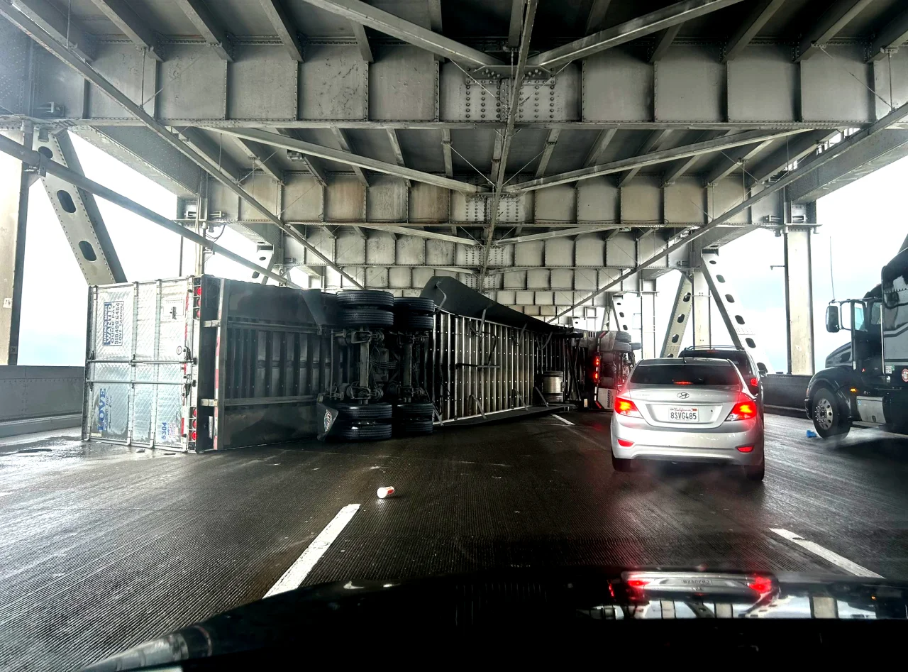Bay Bridge Traffic Halted by Overturned Big Rig During Storm