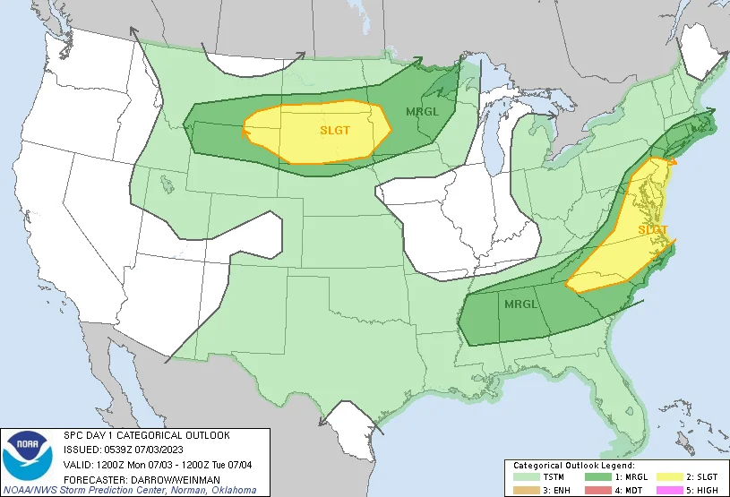 Monday and Tuesday will bring hot and muggy weather with chances of thunderstorms in Minnesota. The Twin Cities area is under a heat advisory, with temperatures expected to reach the mid-90s. Severe weather is possible, with a slight risk of storms on Monday and a better chance on Tuesday. Cooler temperatures will arrive midweek.