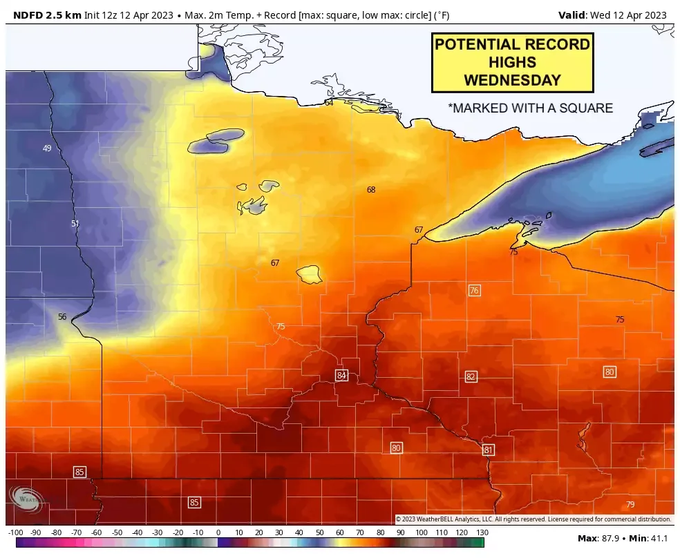 Record warmth and gusty winds on Wednesday will create potentially critical fire conditions in southern Minnesota, while showers will develop on Thursday in the northwest and spread east by Friday night. The early April heat wave prompts the question of whether this is climate change, but the answer is complicated. While most months are rapidly warming, February and April are affected by a potential increase in polar vortex disruptions that may be an unintended consequence of human-caused climate change.