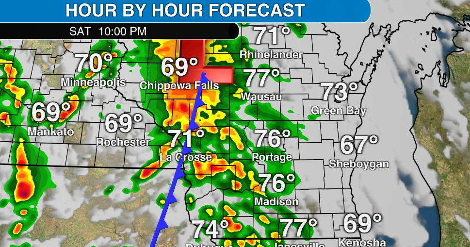 Severe storms are possible in Wisconsin on Saturday afternoon and night as a cold front moves over the state, with damaging wind and hail expected in some areas.