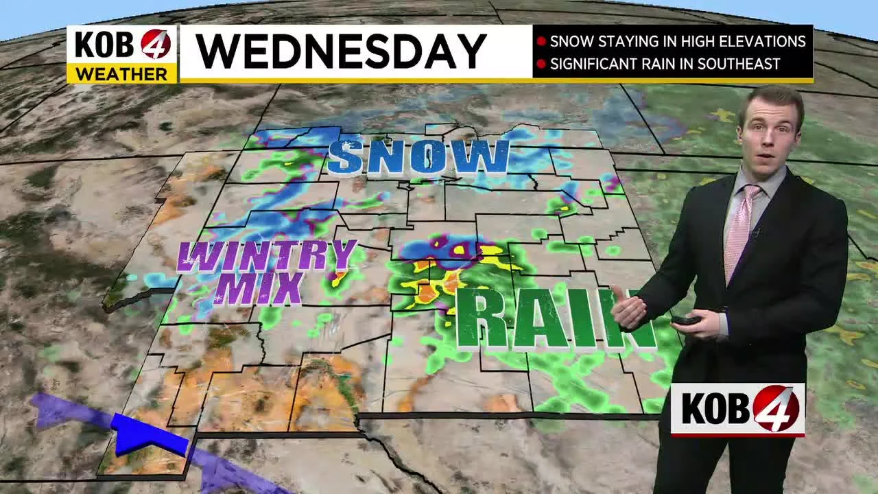 Heavy snowfall is possible for parts of New Mexico on Wednesday, with snowfall accumulation as high as 15 inches in places like Las Vegas and Raton. Santa Fe could see a few inches of snow, while Clovis and Gallup could get a couple of inches. The storm will also bring rainfall, with up to an inch or more of rain possible. Meteorologist Brandon Richards provides a full preview of the upcoming weather conditions.