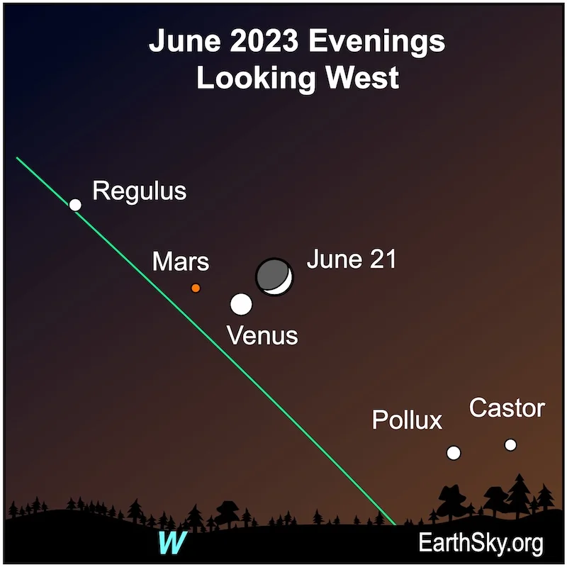 On June 21, 2023, the solstice will bring the first day of summer to the Northern Hemisphere and the first day of winter to the Southern Hemisphere. Skywatchers can spot a cosmic trio of the crescent moon, Venus, and Mars in the solstice sky. The waxing crescent moon will be glowing next to brilliant Venus with the much dimmer Mars nearby. The lineup will tilt the opposite direction in the Southern Hemisphere.