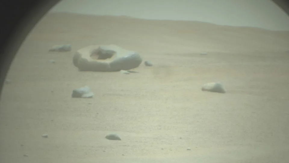 The Mars rover Perseverance has captured an image of a mysterious doughnut-shaped rock on the planet's surface in the Jezero Crater. The rock, about 100 meters away, has not been examined or sampled by the rover, leaving its exact makeup and origins unknown. Scientists have hypothesized that it could be a meteorite or a rock transported by a river channel. Some suggest that the doughnut shape may have been created by erosion upon entering Mars' atmosphere. The rover team currently has no plans to investigate the rock further as it continues its mission in a different direction.