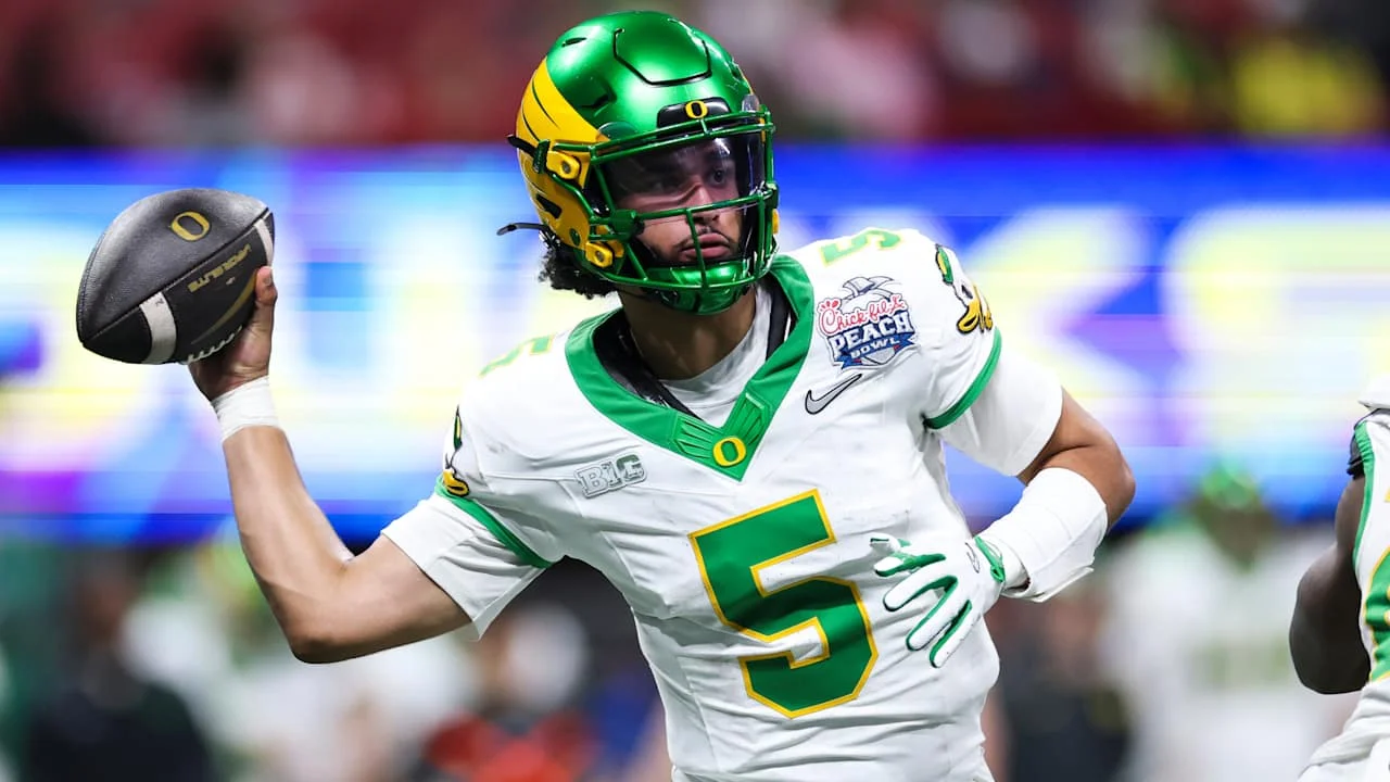Oregon quarterback Dante Moore announced on ESPN that he will return to the Ducks for the 2026 season, choosing another college year over entering the NFL draft. This season he threw for 3,565 yards and 30 touchdowns with 10 interceptions as Oregon finished 13-2, capped by a CFP semifinal loss to Indiana in which he had three first-half turnovers. Moore, who began at UCLA before becoming Oregon’s starter, was praised by coach Dan Lanning, who had hoped he’d stay. The Ducks also added transfer Dylan Raiola, while tight end Kenyon Sadiq and safety Dillon Thieneman declared for the NFL draft, and several players including Iapani Laloulu, Jamari Johnson, Teitum Tuioti and Matayo Uiagalelei plan to return.