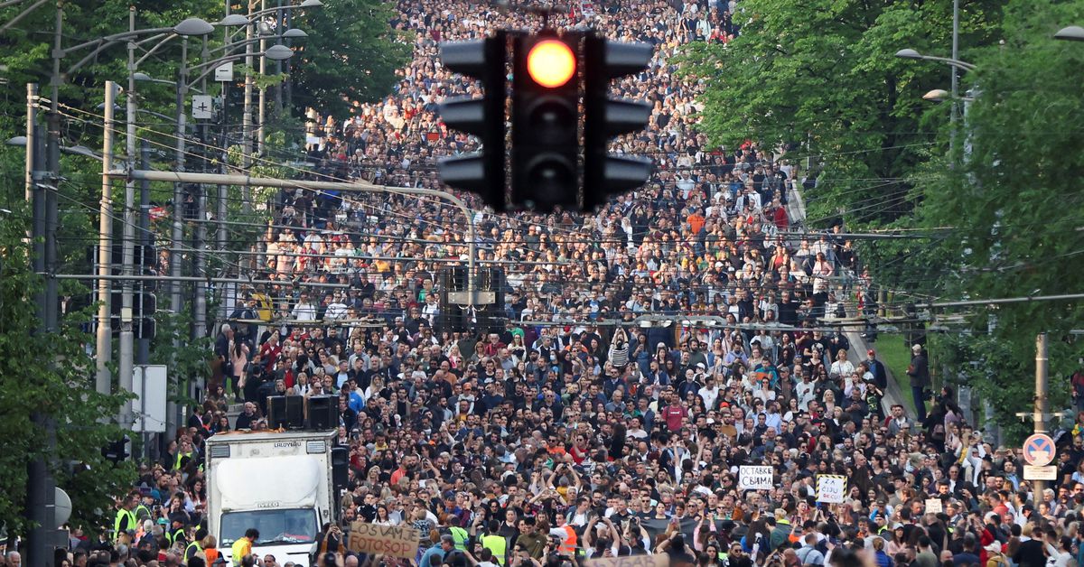 Tens of thousands of Serbians have joined an anti-government protest in Belgrade for the sixth time since May 3, blaming a culture of violence for the deaths of 18 people in two mass shootings and calling on the interior minister to resign. Protesters are demanding the resignation of Serbia’s interior minister, Bratislav Gasic, and secret service chief Aleksandar Vulin, who they blame for failing to bring criminal groups to justice. The demonstrators also called for the withdrawal of national broadcast licences for television channels Pink TV and Happy TV and a ban on some tabloids who they blame for promoting violence.