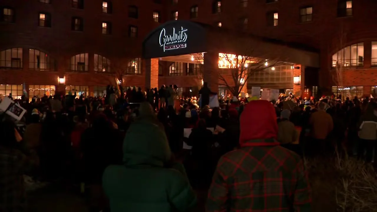 Hundreds protested anti-immigration enforcement overnight in Minneapolis, outside the Graduate by Hilton hotel and the Bishop Henry Whipple Federal Building, as police dispersed crowds amid reports of property damage and three arrests; no injuries were reported, with related demonstrations occurring at a nearby Canopy Hotel earlier.