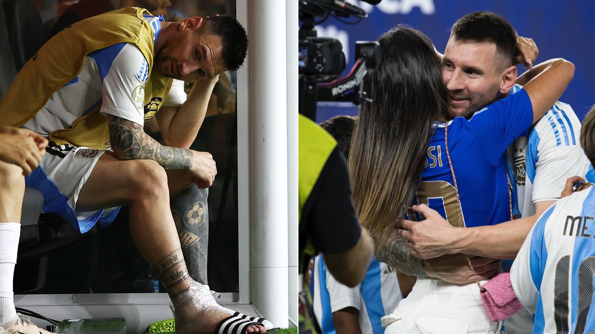 Antonela Roccuzzo showed visible concern for her husband Lionel Messi's swollen ankle after Argentina's victory, as captured in footage at the Hard Rock Stadium. The extent of Messi's injury is still unknown, but he has the support and love of his family during his recovery.