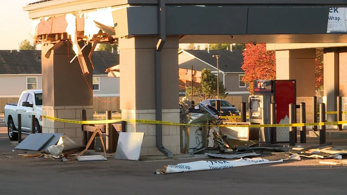 Thieves in Colorado Springs attempted to steal an ATM from an Ent Credit Union using a forklift, but were unsuccessful. The ATM was found mangled and the roof damaged. The credit union remains open, and the incident is under investigation by the Colorado Springs Police Department.