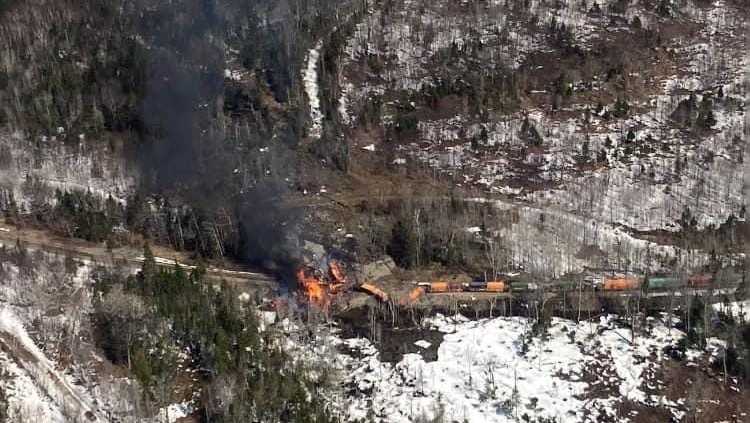 A train derailment in Somerset County, Maine, caused flames and smoke above Moosehead Lake. The three crew members miraculously escaped serious injury. The derailment may have been caused by a build-up of melting ice and debris that washed out part of the railroad track. No hazardous material left the tracks, but flammable wire and ethanol were noticed in sealed containers in cars left upright. Canadian Pacific Railway's response was applauded, and they continue to conduct a full assessment of the situation.