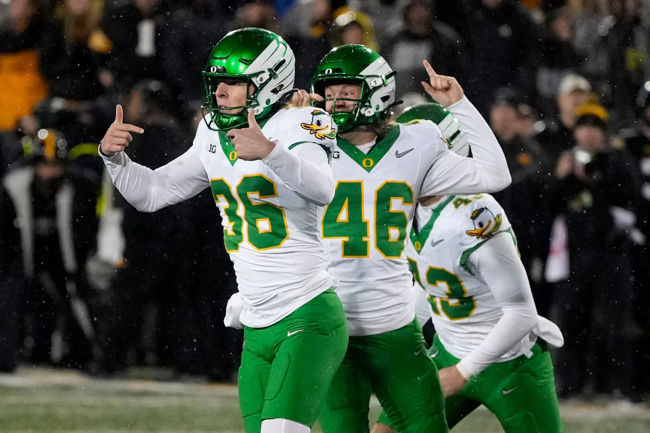 No. 9 Oregon narrowly defeated No. 20 Iowa 18-16 in a weather-affected game, with a last-second field goal securing their win and bolstering their College Football Playoff hopes.