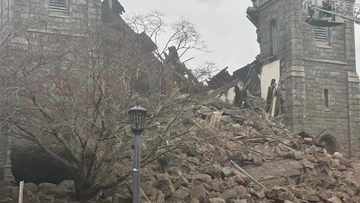 Emergency crews are investigating a church collapse in New London, Connecticut, after the First Congressional Church on Union Street suffered a roof collapse, leaving a large pile of rubble and stones where the entrance once stood. The New London Fire Department is on the scene assessing the situation, and citizens are urged to avoid the area as details about potential injuries or anyone inside the church remain unclear.