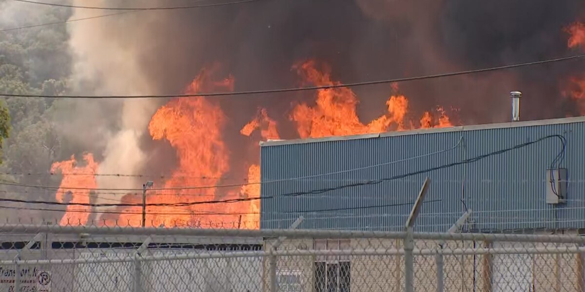 A large fire broke out at a commercial building in San Pedro, Los Angeles, causing flames to shoot through the roof; firefighters responded to the scene, and no injuries or evacuations have been reported, with the cause under investigation.