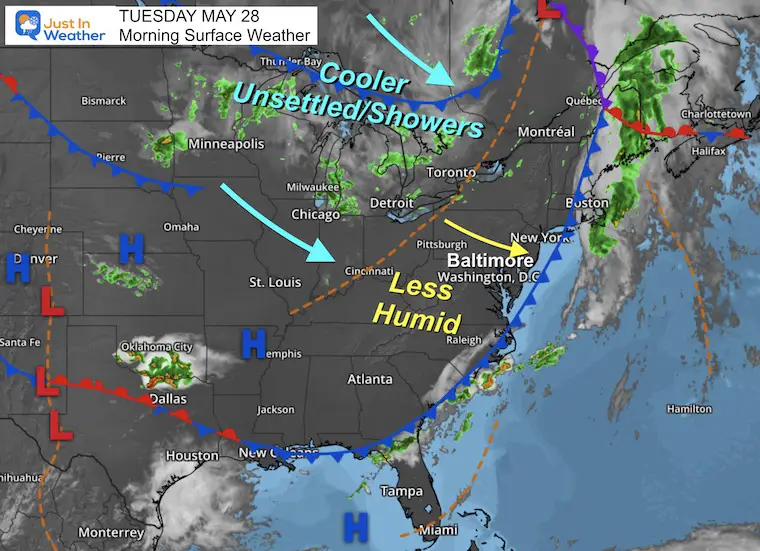 Severe storms hit central Maryland with wind damage but no tornadoes, while Lancaster County, PA reported one tornado. Cooler, less humid air is moving in, bringing more showers and potential hail. Temperatures will drop, leading to a chilly end to the work week.