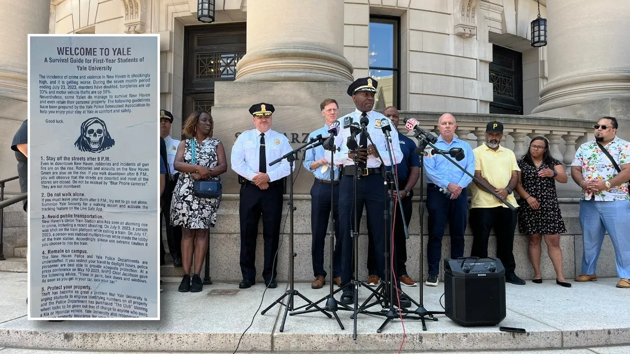 The Yale Police Union distributed flyers featuring the Grim Reaper to incoming students at Yale University, claiming that crime in New Haven is worsening. Yale and city officials criticized the pamphlets as misleading and fear-mongering. The flyers cited statistics from the New Haven Police Department, stating that murders have doubled, burglaries are up 33%, and motor vehicle thefts have increased by 56%. However, officials pointed out that homicide numbers are lower than they were in early August 2021, and robberies on campus have decreased by 30%. The police union defended their actions, stating that they wanted to ensure students' safety. The controversy sparked a debate about campus safety and the responsibility of the police union.
