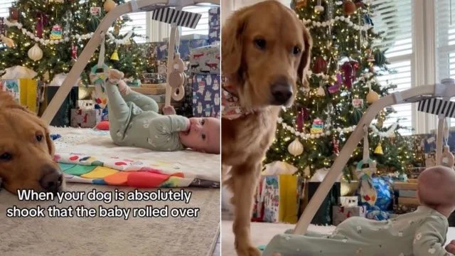 A viral video shows a Golden Retriever named Huckleberry being utterly shocked and confused when a baby girl unexpectedly rolls over on her playmat, prompting a humorous and adorable reaction from the dog.