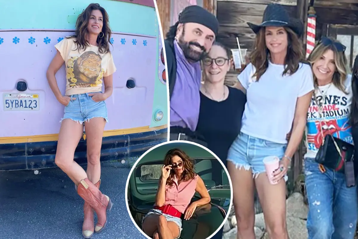 Cindy Crawford posed in tiny denim shorts, cowboy boots, and graphic tees for a photoshoot in Joshua Tree National Park, which will raise money for The American Family Children’s Hospital in Madison, Wisconsin. The supermodel experimented with her looks, sporting a Willie Nelson T-shirt, cowboy hat, and Western boots. The photos will be sold, with proceeds going towards charity.