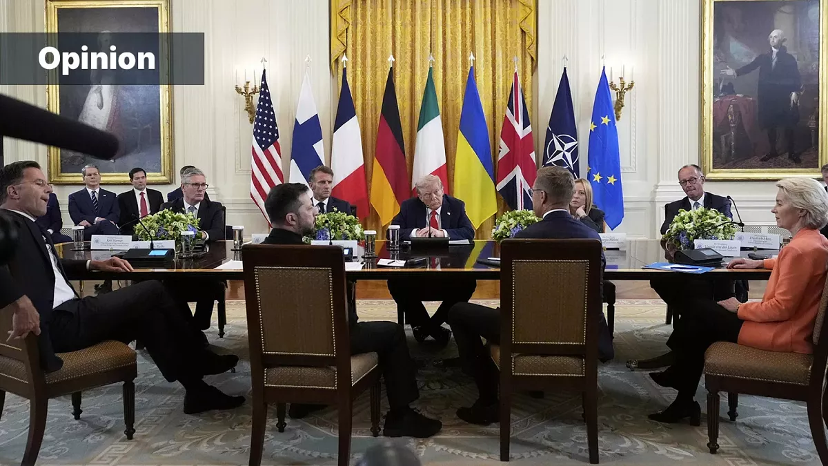 The article criticizes Europe's reliance on the US for security and support in Ukraine, highlighting a symbolic and strategic subordination during a visit to Washington where European leaders appeared to plead for US backing rather than negotiate as equals, exposing Europe's lack of strategic autonomy and dependence on American power.