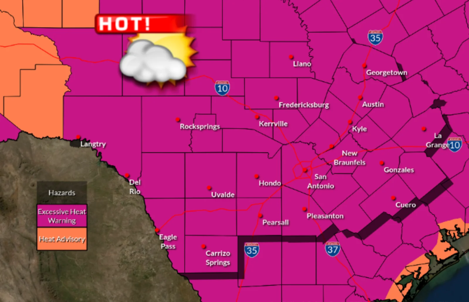 Central Texas, including Austin and surrounding counties, is under a severe thunderstorm watch and heat advisory on Tuesday, with the National Weather Service warning of damaging winds, hail, and isolated tornadoes. Rain and thunderstorms are expected to persist through the weekend, with temperatures potentially reaching up to 102 degrees and heat index values up to 110.