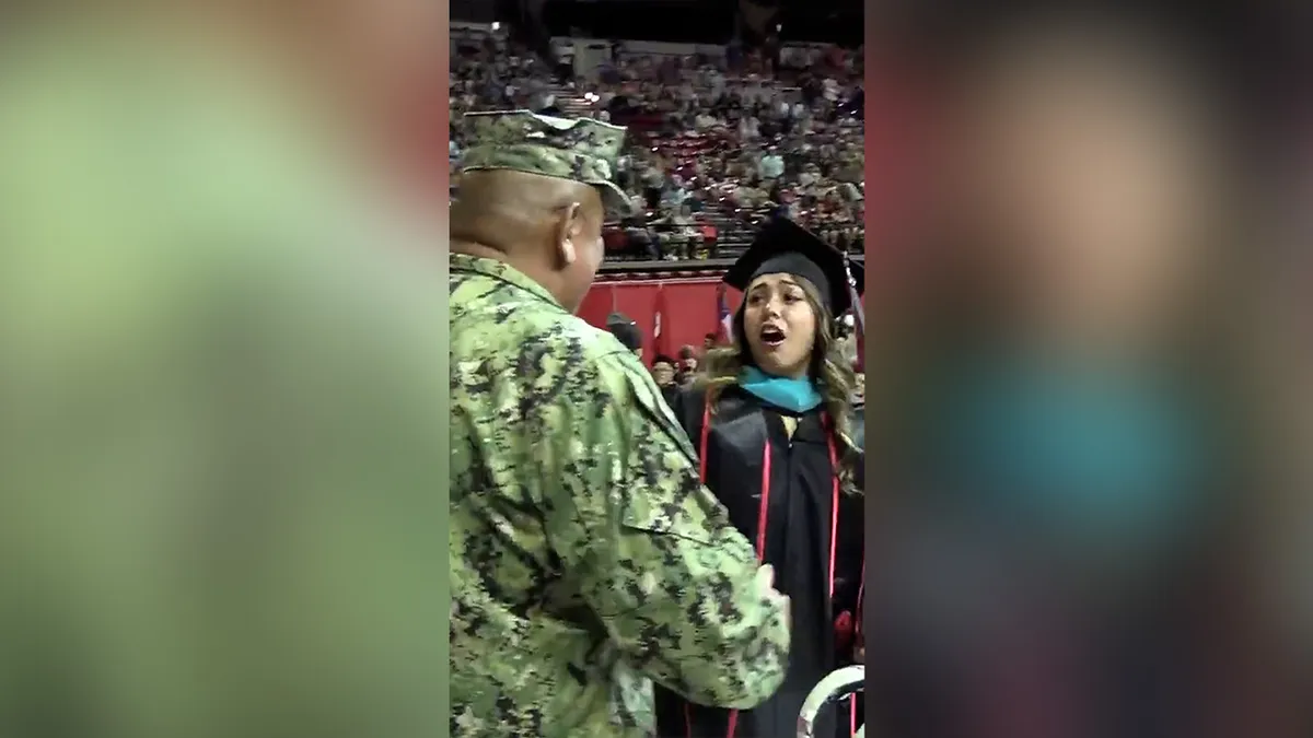 Navy Petty Officer Second Class Douglas Hernandez surprised his daughter, Pamela Hernandez, by traveling 30 hours from Dubai to attend her master's degree graduation ceremony at the University of Nevada Las Vegas. Pamela had resigned herself to the fact that her father wouldn't be able to attend due to his posting in Dubai. The heartwarming surprise was captured on video and shared by Humankind from USA TODAY.