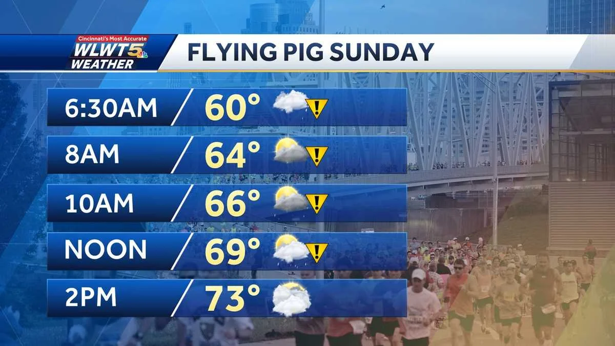 The Flying Pig Marathon on Sunday may be impacted by scattered showers and potential thunderstorms, with the exact timing still uncertain. The rain threat is expected to increase to a high level of impact, and runners will also have to deal with warm and humid conditions. However, the rain and storm threat should mostly be over by early afternoon. The weather forecast for Saturday's events leading up to the marathon is also provided.