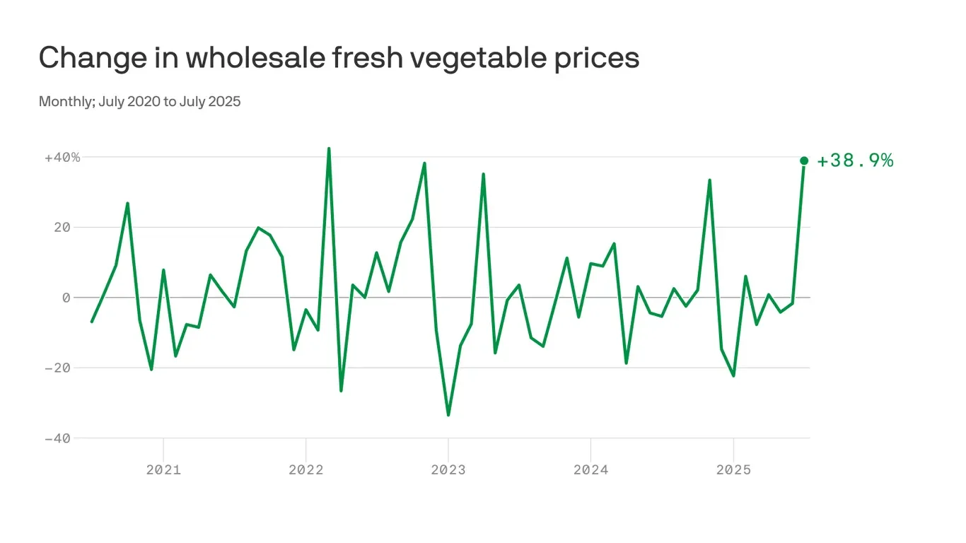 Wholesale vegetable prices in the U.S. surged to record levels in July, driven by tariffs and import issues, signaling potential increases in grocery store prices and inflation concerns for consumers.
