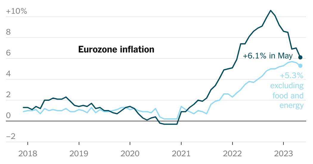 Inflation in the Eurozone fell to 6.1% in May, the lowest level in over a year, due to a slowdown in energy price increases. However, food and service costs continued to rise, leading to concerns that the European Central Bank will continue to raise interest rates to curb inflation. Core inflation, which excludes volatile food and energy costs, rose 5.3%. Despite government efforts to protect consumers from rising prices, food, alcohol, and tobacco costs increased by 12.5% annually in May. The labor market remains tight, with unemployment at a record low and hourly labor costs rising at a record pace.