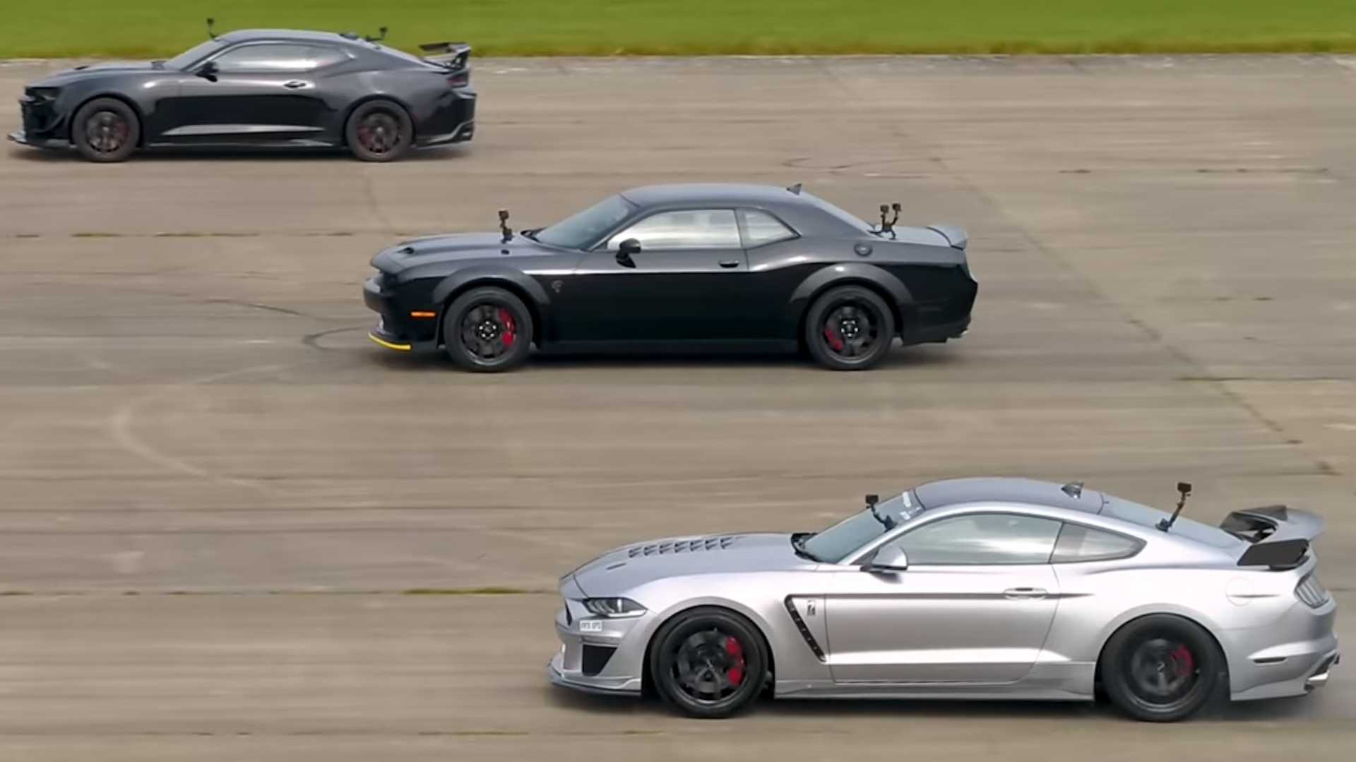 A new Carwow video shows a tuned Camaro ZL1 and Mustang GT drag racing against a stock Dodge Challenger SRT Hellcat. The Camaro finished second in the first race, while the Mustang struggled for traction. However, the Mustang won the next two races, beating the Challenger to the quarter-mile finish line both times. The Dodge won both rolling races but lost the brake test.