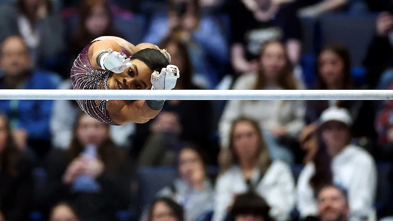 Simone Biles leads the U.S. Gymnastics Championships after Day 1 with a 3.4-point advantage, aiming for her ninth all-around title. Biles excelled in all events, including a standout vault and floor routine. Suni Lee, recovering from kidney issues, finished fourth. Shilese Jones and Gabby Douglas withdrew due to injuries. Sunday's competition will finalize national champions and Olympic trial qualifiers.