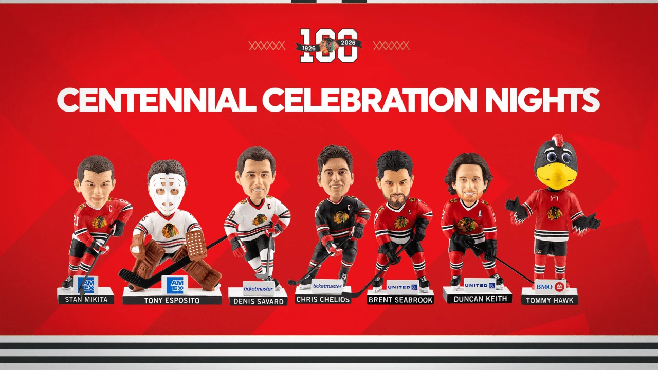 The Chicago Blackhawks announced their 2025-26 season promotional schedule celebrating their 100th anniversary with themed chapters, special game nights, alumni appearances, and exclusive giveaways, including bobbleheads of legendary players, to honor their rich hockey legacy.