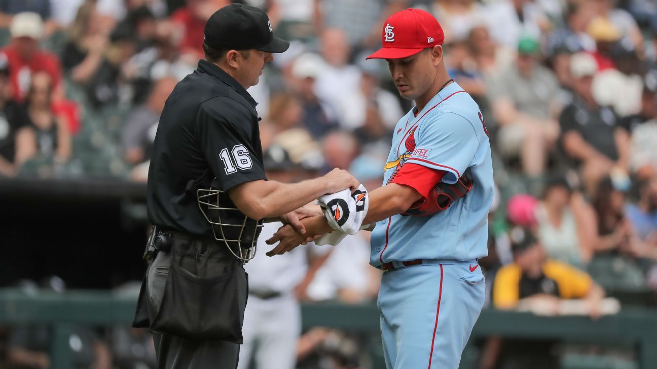 St. Louis Cardinals reliever Giovanny Gallegos had rosin wiped off his left arm by plate umpire Lance Barrett during the team's 3-0 victory over the Chicago White Sox. Gallegos had hit his arm with the rosin bag after warming up, which is considered illegal. Barrett cleaned off Gallegos' arm twice during the game, reminding him of the rule. Gallegos expressed frustration with the second visit, referencing a previous incident in 2021 when he was ordered to switch caps due to a substance on it.