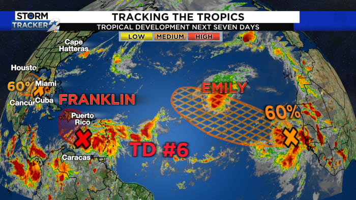 Sunday marked the hottest day of the year so far, with record-breaking temperatures across many areas. A tropical wave moving across the Gulf has a 60% chance of development, potentially becoming Tropical Storm GERT. While it will bring much-needed rainfall to parts of south Texas, areas further north will only experience scattered rain bands. The Atlantic Basin is also seeing increased tropical activity, with two named storms, Emily and Franklin, and several other areas with potential for development. Tropical Storm Hilary is bringing heavy rainfall to Southern California and Nevada. The 10-day forecast predicts continued triple-digit heat before a change in weather pattern brings widespread rain and lower temperatures next week.