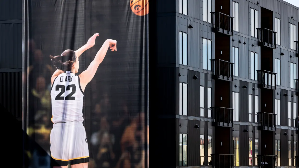 A giant Nike advertisement featuring basketball star Caitlin Clark has been unveiled in downtown Iowa City, showcasing the rising athlete's partnership with the brand and her impact on the local community. The larger-than-life billboard serves as a testament to Clark's growing influence in the world of sports and her connection to the city of Iowa.