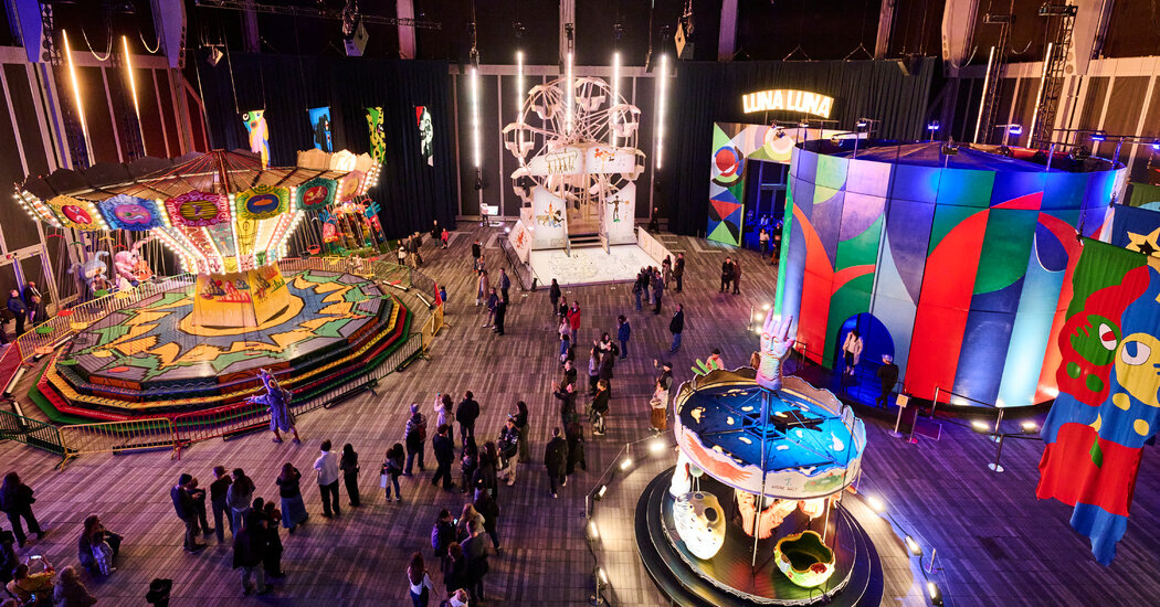 Luna Luna, an art amusement park that originally appeared in Hamburg in 1987, has been resurrected in Los Angeles, drawing visitors from around the world. The park features attractions such as a Ferris wheel designed by Jean-Michel Basquiat, a merry-go-round by Keith Haring, and installations by David Hockney and Roy Lichtenstein. While the rides are off-limits, visitors can explore pavilions by renowned artists and even get married at André Heller's "Wedding Chapel." The exhibition, which has gained popularity through social media, is expected to remain open into the spring.