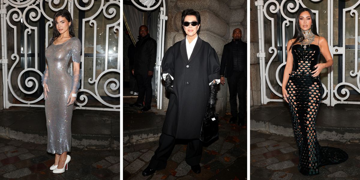 Kim Kardashian, Kylie Jenner, and Kris Jenner made a grand entrance at Maison Margiela’s show during Paris Couture Week, each showcasing their individual styles in fabulous looks from the fashion house. Kris Jenner wore a sleek, baggy black suit with Margiela’s controversial Tabi shoe, while Kim opted for a dramatic hourglass silhouette bodycon dress and a massive silver choker necklace. Kylie chose a dreamy, semi-sheer silver sequin dress with gauzy gray gloves and chunky white doll-like pumps, completing her ethereal style streak in Paris.