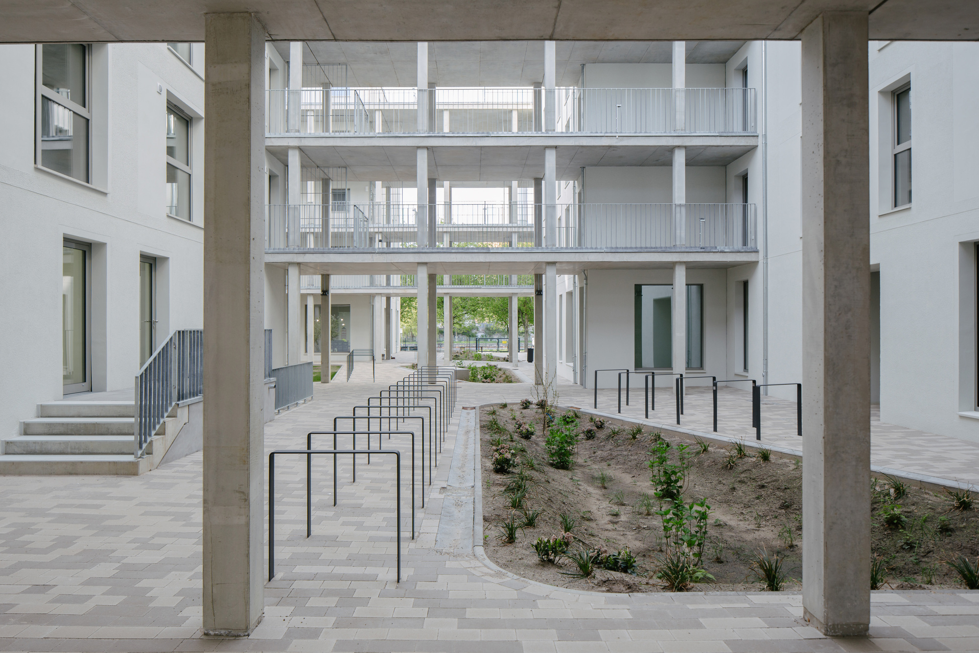 The Arcostraße Housing Complex in Berlin, designed by blrm Architekt*innen, incorporates elements from the regulations of the Berlin block and adapts them to the present time. The complex includes five individual buildings staggered in the inner area of the property, with walkways replacing the side wings of the Berlin buildings. The mixed-use development welcomes guests from the Spree side with a gastronomy establishment and includes small commercial units and a daycare center in the individual courtyards. The upper floors are designated for residential use, with a range of apartments accommodating diverse lifestyles and different needs.