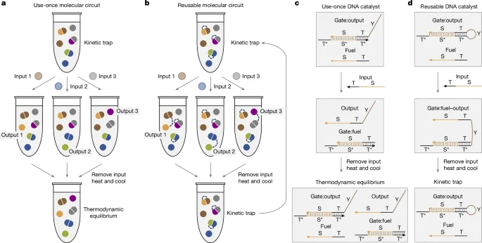 The article presents a novel enzyme-free DNA circuit architecture that uses heat to reset and recharge molecular systems, enabling sustainable, out-of-equilibrium computation, neural networks, and logic gates without waste build-up, scalable to complex systems like a 100-bit neural network for digit classification.