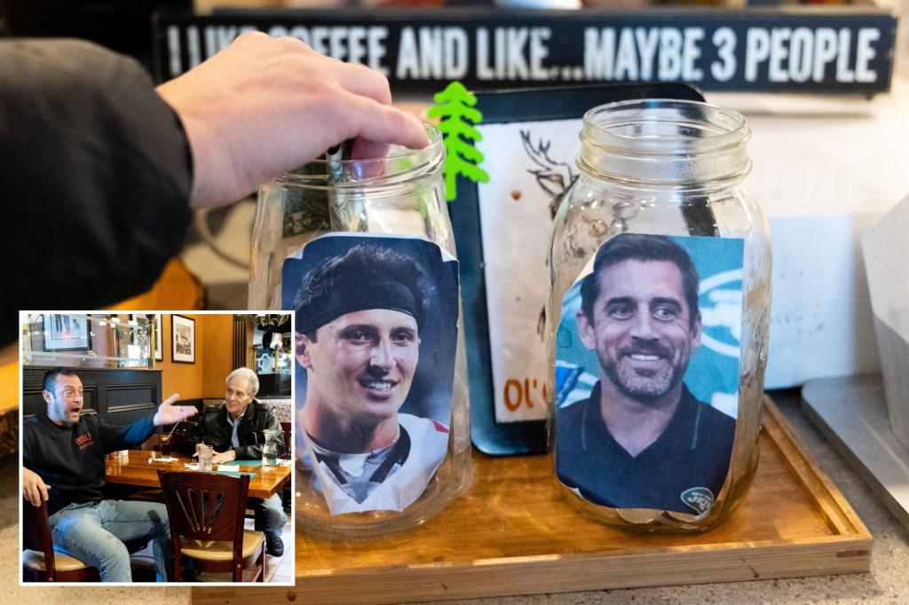 Aaron Rodgers and Tommy DeVito, two NFL quarterbacks, live just 8/10th of a mile apart in Cedar Grove, New Jersey. DeVito, a local hero, is winning a playful tip war against Rodgers at a popular coffee shop, with customers filling his tip jar four times more than Rodgers'. While DeVito enjoys a middle-class lifestyle, Rodgers resides in a luxurious $9 million mansion. Local businesses and residents in Cedar Grove have shown support for DeVito, considering him an underdog and praising his down-to-earth nature, while also finding Rodgers "adorable."
