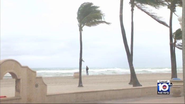 A flood watch is in effect for Miami-Dade and Broward counties in South Florida, with a coastal flood statement in effect for the Florida Keys. The region is experiencing windy, rainy, and colder weather from Wednesday to Friday, with scattered rainfall expected. Temperatures will increase to the mid-upper 70s, remaining windy on Thursday and Friday. Hollywood Beach has red flags warning of rip currents, and the city of Hollywood is taking precautions against beach erosion and flooding.