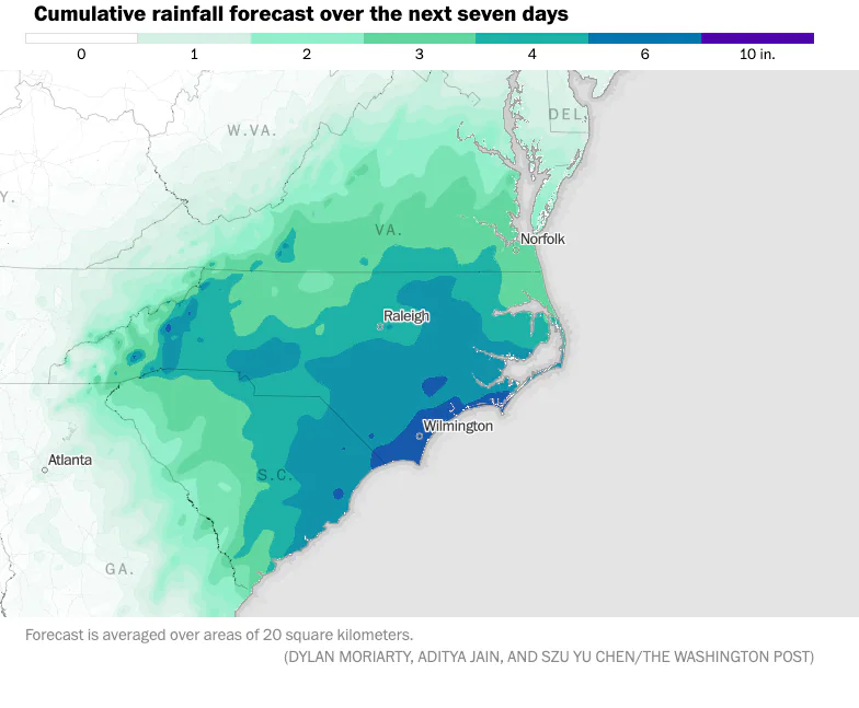 The National Hurricane Center warns of a storm forming near the Southeast, potentially stalling offshore of the Carolinas early next week, bringing heavy rain, damaging winds, and large waves to coastal areas.