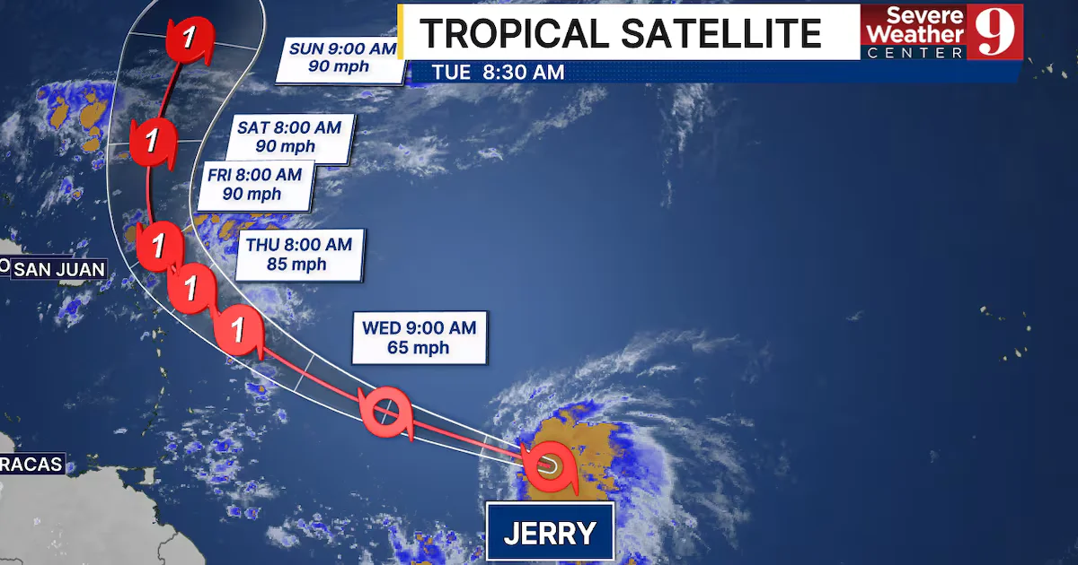 Tropical Storm Jerry has formed in the western Atlantic as the tenth named storm of the 2025 hurricane season, with potential to strengthen into a major hurricane. It is expected to move west-northwest then turn sharply north, possibly affecting the Leeward Islands and the East Coast, with uncertainty about its final strength.