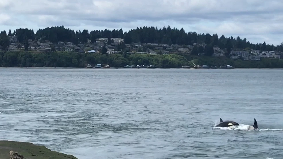 A pod of orca whales was observed playing near the shore of Commencement Bay near Tacoma, with uncertainty about whether they were Southern Residents, which have been absent from the area for over 8 weeks, possibly due to environmental factors affecting salmon populations.