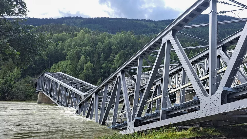 A section of a railway bridge in southeastern Norway collapsed into the Laagen River due to damage to the central bridge foundation caused by torrential rains. The collapse occurred after all traffic across the bridge was halted a week ago due to fears of its collapse. The bridge, built in 1957, is 172.5 meters long and has a direct foundation on the riverbed. The heavy rain also led to evacuations, a collapsed hydroelectric river dam, a derailed train, and transportation disruptions across the Nordic and Baltic region.