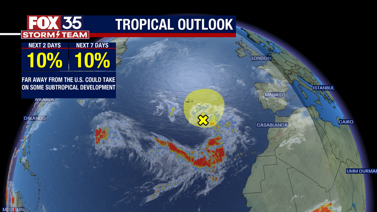 The National Hurricane Center is monitoring a tropical disturbance northeast of the Bahamas, with a 10% chance of formation over the next 48 hours and over the next seven days. Meanwhile, Colorado State University predicts a slightly below average Atlantic hurricane season with 13 named storms, six hurricanes, and two major hurricanes. Central Florida will see higher rain chances on Monday and Tuesday, with an isolated severe storm or two on Monday afternoon.