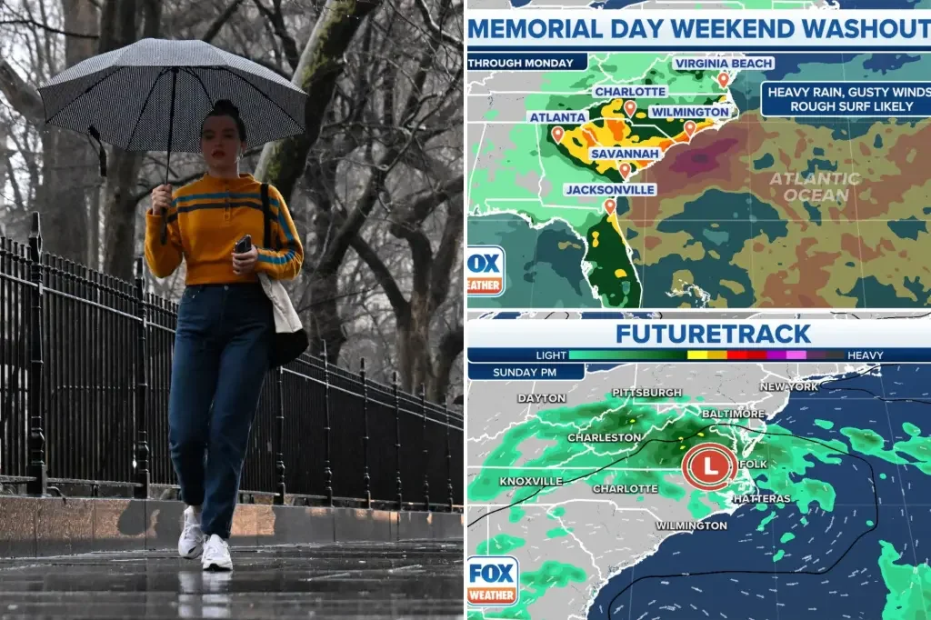Heavy rain, gusty winds, and rough surf are expected for parts of the East Coast for the Memorial Day weekend, potentially ruining travel plans for millions vacationing during the unofficial start to summer. A tropical disturbance developing over the western Atlantic could cause a holiday weekend washout for parts of the Carolinas and the Southeast coast. Regardless of tropical development, a period of heavy rain, rough surf, and gusty winds will impact coastal regions of the Southeast later this week and into the Memorial Day weekend. More than 42.3 million Americans will travel 50 miles or more from home this weekend. A large ridge of high pressure over the Northeast is going to deliver the saving grace this weekend for those there, keeping the forecast dry north of Washington, D.C.