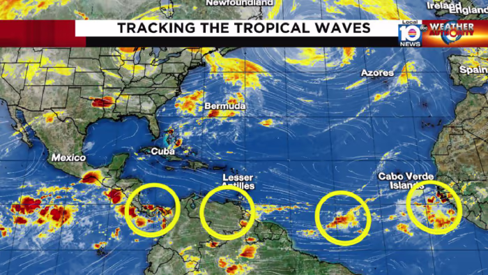 Hurricane Erin is intensifying with 110 mph winds and is expected to pass east of North Carolina, causing storm surge, coastal flooding, and large waves, before weakening and becoming extratropical as it recedes out to sea. Two tropical waves are also being monitored for potential development.