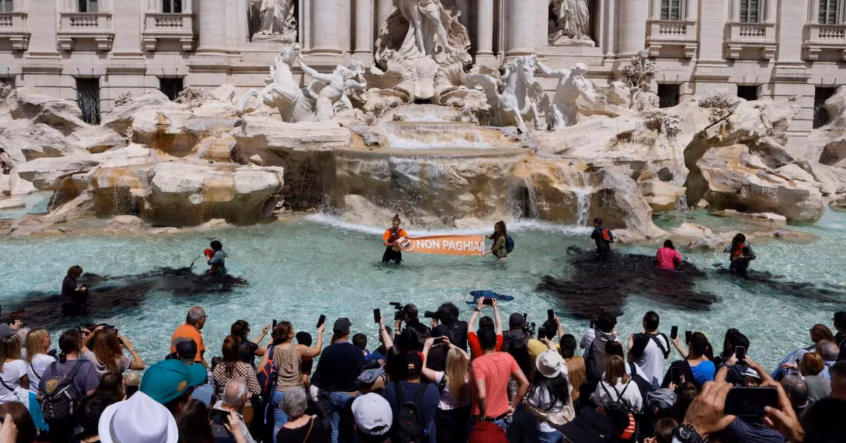 Climate activists darken Rome's Trevi Fountain in protest.
